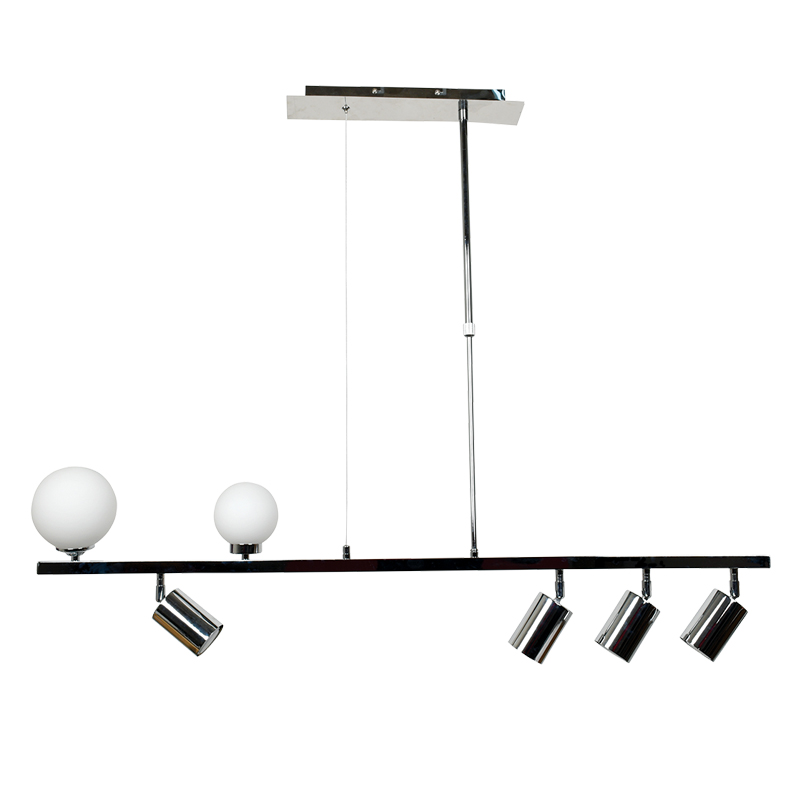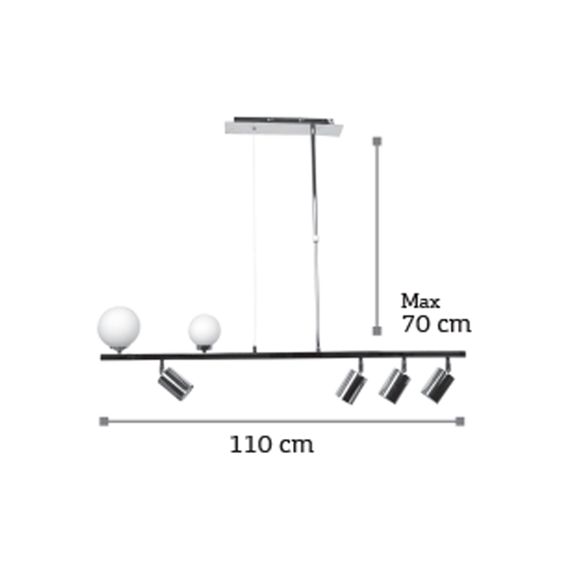 Πρόκειται για ένα κρεμαστό χρώμιο μεταλλικό φωτιστικό. Ο φωτισμός του είναι συνδυαστικός, αποτελούμενος από δύο λαμπτήρες διάχυσης καλυπτόμενους από λευκή οπαλίνα και τέσσερις λαμπτήρες πιο εστιακούς καλυπτόμενους από μεταλλικό καπάκι. Η ανάρτηση είναι ρυθμιζόμενη ώστε να προσαρμοστεί στον χώρο τοποθέτησής του.
