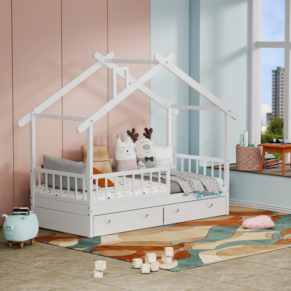 Αφήστε τη φαντασία του παιδιού σας να τρέξει με το νέο κρεβάτι Moonlight Montessori της Bebe Stars. Ο ιδιαίτερος σχεδιασμός σε σχήμα σπιτιού προσθέτει γοητεία και χαρακτήρα στο υπνοδωμάτιο του παιδιού. -Το κρεβάτι με πλαίσιο έχει σχεδιαστεί σύμφωνα με τις αρχές της ανεξαρτησίας επίπλων Montessori. Σας εξοικονομεί πολύ χώρο στο δωμάτιο του μωρού και δεν χρειάζεται να φοβάστε ότι το μωρό σας μπορεί να κυλήσει από το κρεβάτι χάρη στα πλαϊνά κιγκλιδώματα, τα οποία διαθέτει. -Ακόμη, διαθέτει δύο ευρύχωρα συρτάρια, για αποθηκευτικό χώρο των ρούχων και παιχνιδιών του παιδιού σας. - Ένα καταπληκτικό κρεβάτι, όπου τα παιδιά μπορούν να κοιμούνται και να παίζουν, καθώς κάνει τη μετάβαση από μια κούνια σε ένα παιδικό κρεβάτι ομαλά. Το κρεβάτι είναι ανθεκτικό και μπορεί να συνεχίσει να εξυπηρετεί τα παιδιά σας καθώς μεγαλώνουν. -Δέχεται στρώμα 200cmx90cm. (Δεν περιλαμβάνονται το στρώμα και η προίκα). -Τα παιδικά έπιπλα κατασκευάζονται και συσκευάζονται σύμφωνα με το Ευρωπαϊκό Πρότυπο Ασφαλείας, καθώς και με μη τοξικά χρώματα.